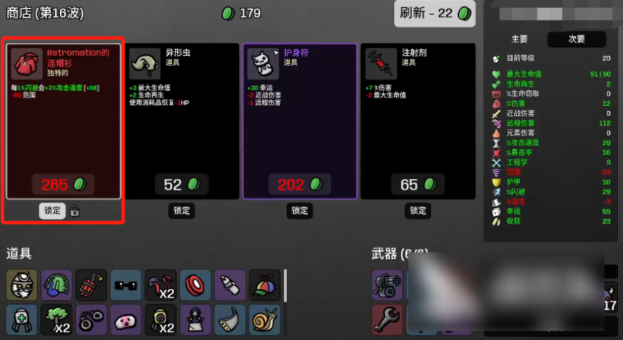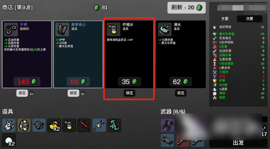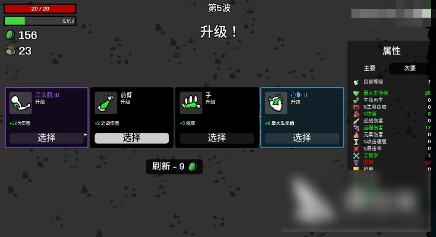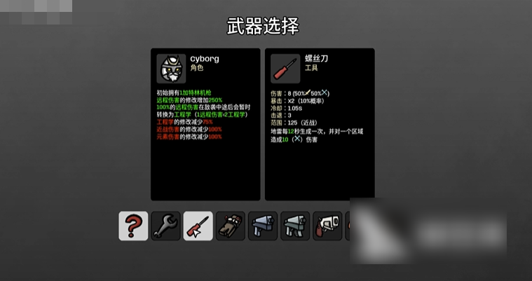 武器:针对他战斗后半段远程伤害转移成工程学属性的设定,在武器选择上一定要选有工程属性加成的武器,这样才不至于到后半段完全没有伤害,因为开局送了一把紫色加特林,再怎么样你的远程伤害也不会被浪费,而如果不拿工程武器,后面就真的等于废了,初始武器这块,最推荐的还是螺丝刀,因为它的地雷生成起来之后伤害频率和范围都很广,能够帮助你快速的清理大批量怪物。