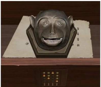 6.切换场景把一截木板放在木桶里,用绳子固定得到空木桶,进入正厅,右边密码盒根据蜡烛长短打开得到猴雕像。