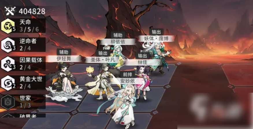 阵容成员如下图所示,这一套激活了天命羁绊,可以在进入战斗时,让我方全体属性提升10%,养成难度低的同时,生存能力比较强,主要依靠叠加灼烧状态来进行持续性的输出;