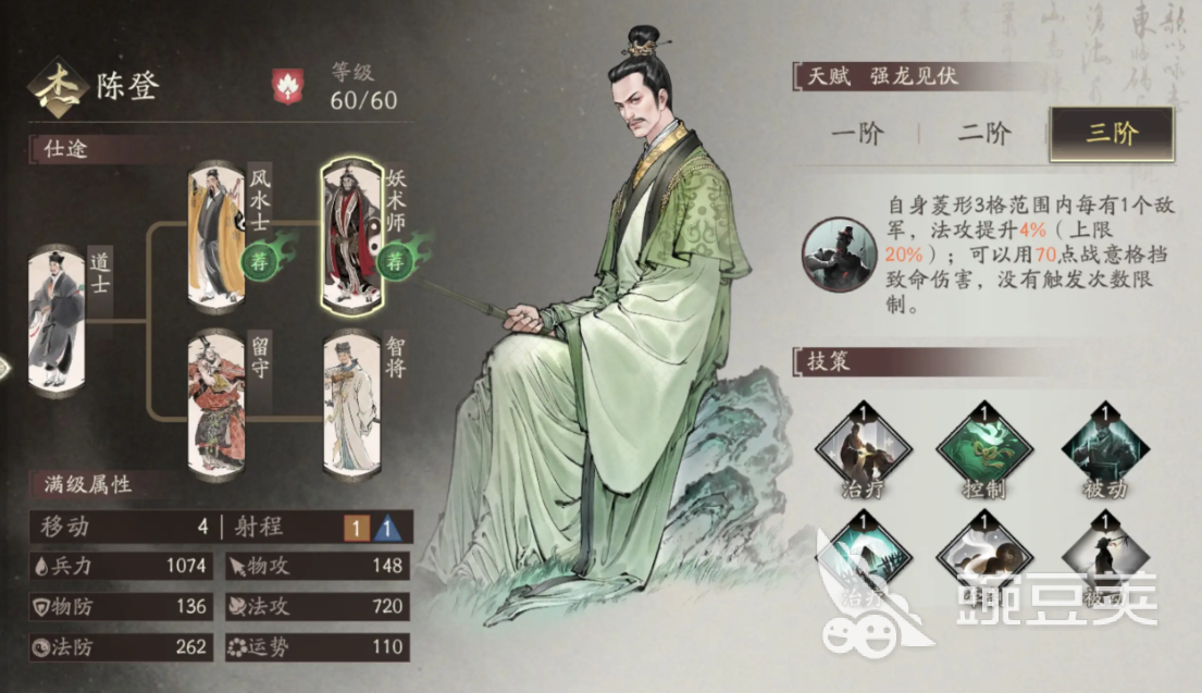 陈登的天赋能在自身3格内每有1个敌军时,让法攻提升4%,可以消耗70战意来格挡一次致命伤害,没有触发次数限制让其有保命也有输出,他的“毒烟”会对范围内敌人造成50%法攻伤,对智力低于自己的目标会额外施加1层中毒持续2回合,他的“毒手尊前”会在自身范围内的敌人释放技能时,增加自己16点的战意,并为目标添加1层中毒,他的“鬼使神差”是一个中规中矩的控制加生存技,会在造成60%伤害后为目标添加1层混乱,成功添加还能给自己施加一个护盾。