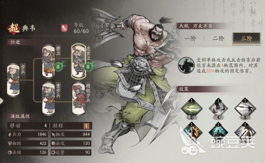 典韦是非常纯粹的狂战士,可以和boss站在原地互砍,他的天赋是在受到单体攻击或反击伤后若伤害来源在自己的4格范围内,对其造成35%物攻的固定伤害,他的推荐技“重击”会攻击单个敌人造成100%物攻伤,并偷取20点战意,他的“折冲御敌”会给一名队友御敌,将其20%遭受的伤害分摊给自己,随后为自己附加一个折冲让自己移动力加1,并提升10%攻心,他的“古之恶来”能在自身每损失10%生命时,提升3%攻防,造成伤害时为敌军附加上降低10%攻防的恶。