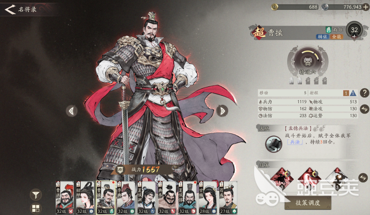 曹操作为开局选择的主角,在有着输出的同时,还有着超强的辅助能力可以给队伍提供超多的增益,可以一直用到后期,他的天赋是在战斗开始之际,赋予所有队友持续3回合兵法,兵法效果可以让持有者的物攻、法攻、物防、法防都加15%,是一个非常全面的增益,他的“短歌行”作为初始自带技,能对敌人造成145%单体伤,并额外回复自身10点战意,他的“振奋”能给范围内所有队友提供昂扬,让他们的所有伤害都提升17%,他的“天下归心”能让范围内队友的战法和技策伤都提升10%。