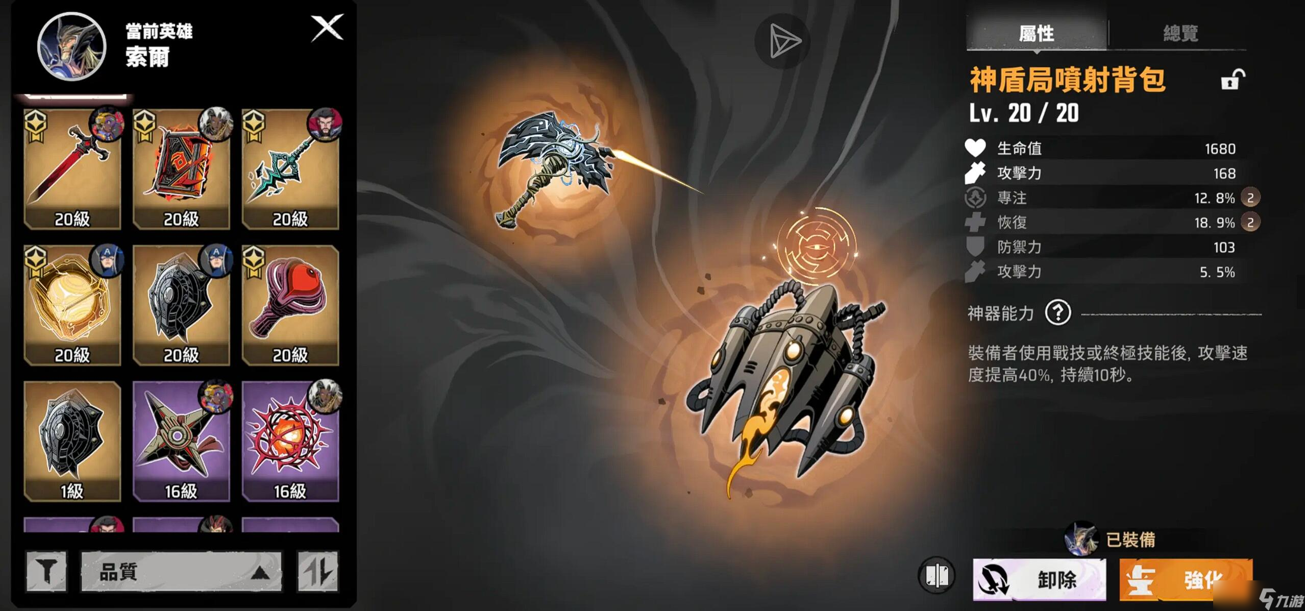物品包括神器和装备,等级上限均为20级。神器升级材料混沌能量通过极限挑战获取,每次挑战耗时10分钟,掉落五六个,装备升级材料振金通过装备副本获取,每日可挑战2次,每次掉落15个。达到满级会有特殊效果,比如神器阿迦莫多之眼满级能将回合回蓝从3点提升至8点,宇宙战衣满级属性:攻击+120、防御+80。效果有质变效果,后期有闲置资源一定要着重培养。