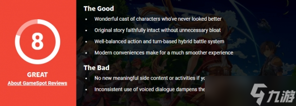 GS评测者表示,本次重制虽极度忠实原作,却也意味着体验过原版的玩家将缺少新玩法内容。所有活动(包括新增烹饪动画的食谱系统)均与原作一致,连多次选项对话环节都未作改动。虽然仍然可以通过"游击士"的选择判断机制体现趣味性,但若能将奖励机制升级为比战斗轻易获得的BP点数更有价值的内容,体验会更好。。