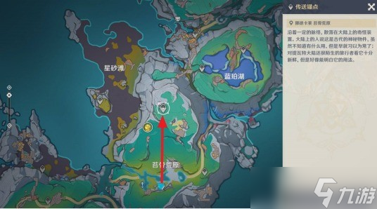 从伦波岛七天神像位置出发,往右上角草地处的传送锚点走。