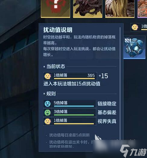 出除了宝箱爆率,爆宝箱这个事情其实本作也是有门道的。扰动值是影响随机物资掉落概率一个机制,每次穿越时空进入玩法挑战,都会让扰动值增长1.5点,当前状态显示1倍掉落,右侧黄色笑脸图标就是“视界失真”状态。系统规则将掉落概率分为三个等级,说到底就是概率问题,具体大家可以看下图。扰动值每日凌晨5点自动刷新,退出关卡时按在关卡内领取的空瓶数额外增加,建议控制每日挑战次数在5次内,避免进入1倍掉落区间。