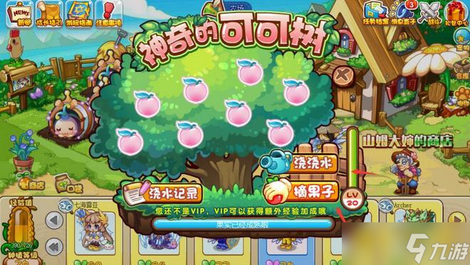 进去之后,点击摘果子即可获得相应的可可果。注意可可果树是有成长时间的,进行浇水可以使其减少时间,最多一次可摘取66个可可果,还是挺不错的。