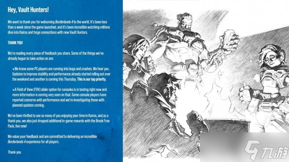 官方在声明中提到:“我们留意到,部分PC玩家在游戏中遭遇了程序错误以及闪退等状况,对此我们高度重视。上周末,我们已经陆续推送了更新补丁,旨在提升游戏的稳定性与性能表现。并且,本周四我们还将上线新一轮更新,这将是当前我们工作的首要任务。对于主机版,FOV调节功能目前正在紧锣密鼓地测试中,详细信息不久后就会公布。同时,针对部分主机玩家反馈的性能问题,我们也在深入调研,并着手规划后续的更新方案。另外值得一提的是,《无主之地4》额外的游戏内奖励现已开放领取,玩家们可不要错过。”