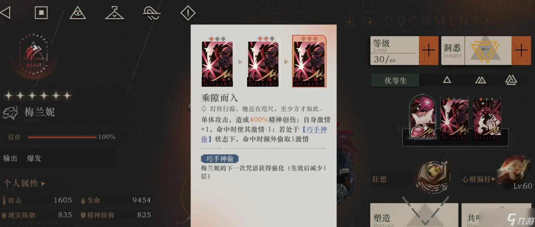 梅兰妮是兽系精神主输出角色,各方面的技能机制都比较完整,缺点就是伤害启动比较慢。但是一旦启动成功,就能依靠大招提供的额外充能达成合适循环,比较适合长线作战。该角色在前期强度比较偏弱,需要在解锁洞悉三后才开始强势,此时对单的输出就会比百夫长强些,但是常态输出与泛用性就会稍弱。如果想要大招连发就必须要角色升到塑造二,不然就需要看运气,要是发牌有问题就打不出合适机制。