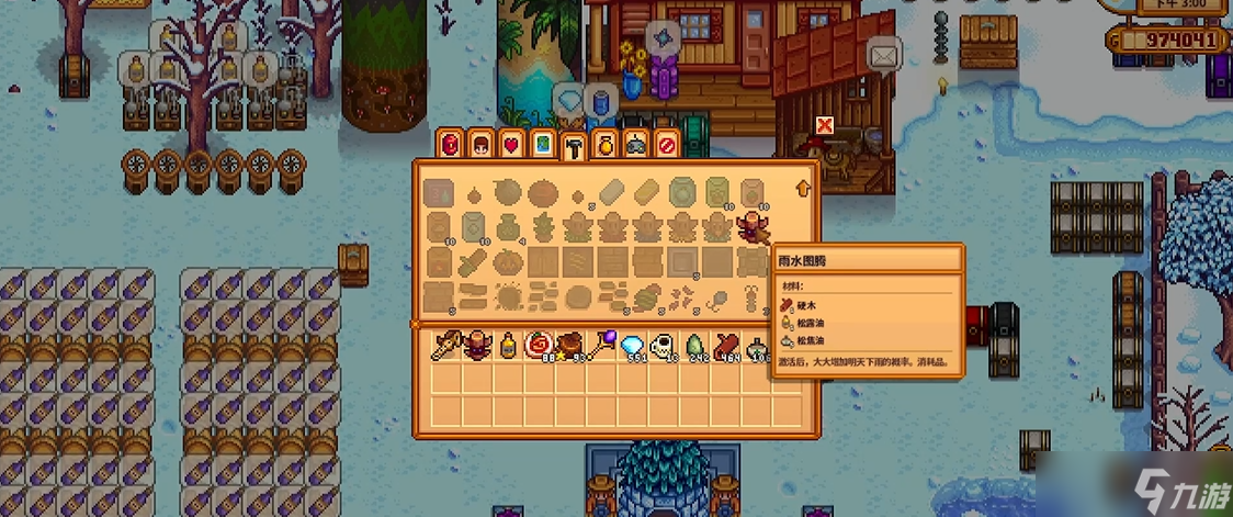 它只能召唤普通雨水,不会引发雷暴天气。节日的前一天或者季节最后一天使用是没效果的,所以记得挑对时机哦!如果不想自己制作,也可以去旅行货车碰碰运气,偶尔会刷出求雨图腾出售,不过价格可能不太友好。建议还是自己动手,既能省钱又能熟悉游戏机制。有了雨水图腾,可以随便种地啦!无论是为了浇灌作物还是完成钓鱼任务,它都能派上大用场。