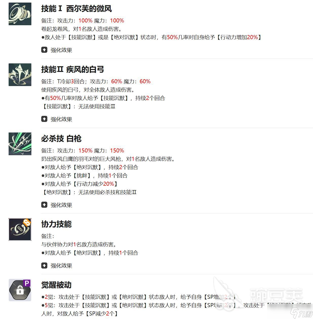 风刃是一个起手技,在击倒或暴击时会触发全体追击,完美适配多段攻击型队友。疾风之白弓不仅仅是有着非常宝贵的群体破甲,而且60%的触发概率在实战中体验下来是相当可靠的了,必杀技白枪则是真正的控场标志性技能,150%的单体伤害配合绝对沉默+挑衅的双重debuff,能精准封锁敌方关键角色的主动技能和必杀。醒被动进一步强化控制,攻击沉默目标时SP回复保证技能的后期combo,5觉后追加的SP削减效果更是让对手直接放不出技能→丢sp→放不出技能的循环,这套技能设计让该角色既能担任副C补伤害,又能作为战术控场大C。