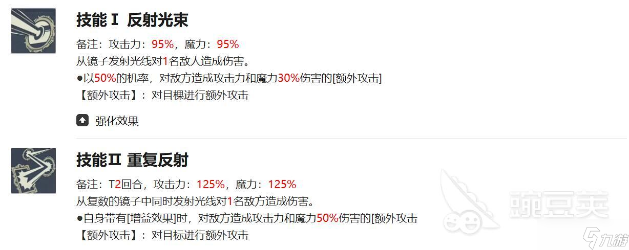 核心技能反射光线对单体造成95%魔攻伤害,50%概率追加30%伤害,不想看脸可以走魔力流,多放技能来弥补脸黑不触发的概率。多重反射消耗3回合CD,造成125%魔攻伤害,自身有buff时追加50%伤害,强化后附加22%暴击率。而全反射的AOE造成150%魔攻伤害,暴击时追加90%伤害。大家可以看出技能依赖反射与追加攻击,需暴击和buff触发最大化输出,没有成型暴击也就是会心的话,会极大的降低战力。