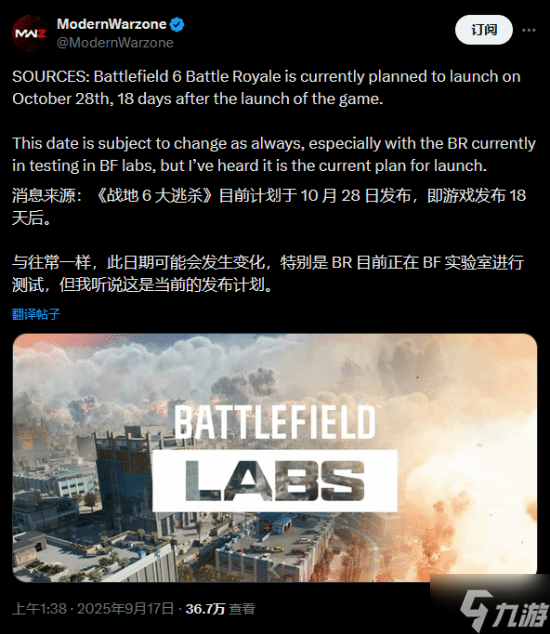 这一消息来自业内知名消息人士ModernWarzone,他此前曾准确泄露过一些关于《使命召唤》和《战地》系列的一些相关细节。但他也强调这一日期可能会有所变化,毕竟这一模式目前仍在战地实验室中接受测试。