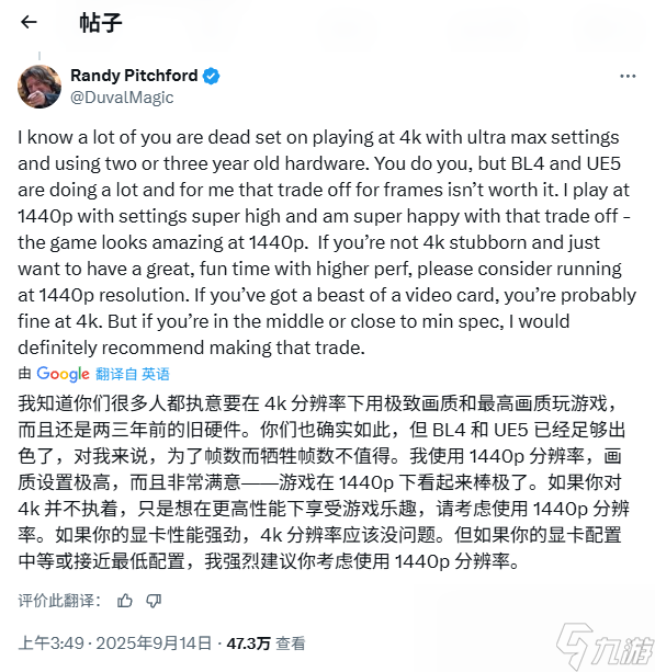Pitchford 在推文中表示:“每一位 PC 玩家都必须接受硬件性能与软件运行表现之间的现实关系。”他强调,《无主之地4》为玩家提供了多种工具来平衡帧数、分辨率与渲染效果。如果玩家对体验不满,可以通过调整这些工具来匹配个人偏好。