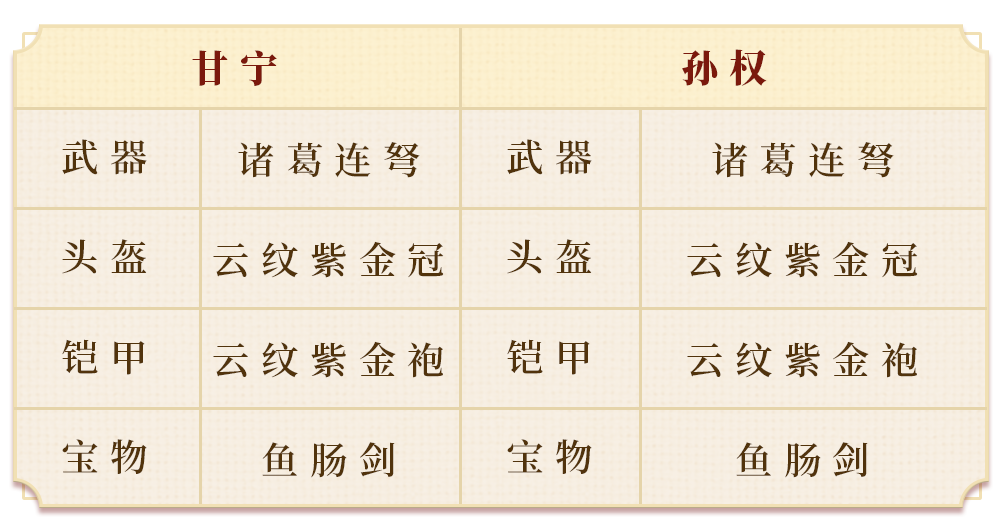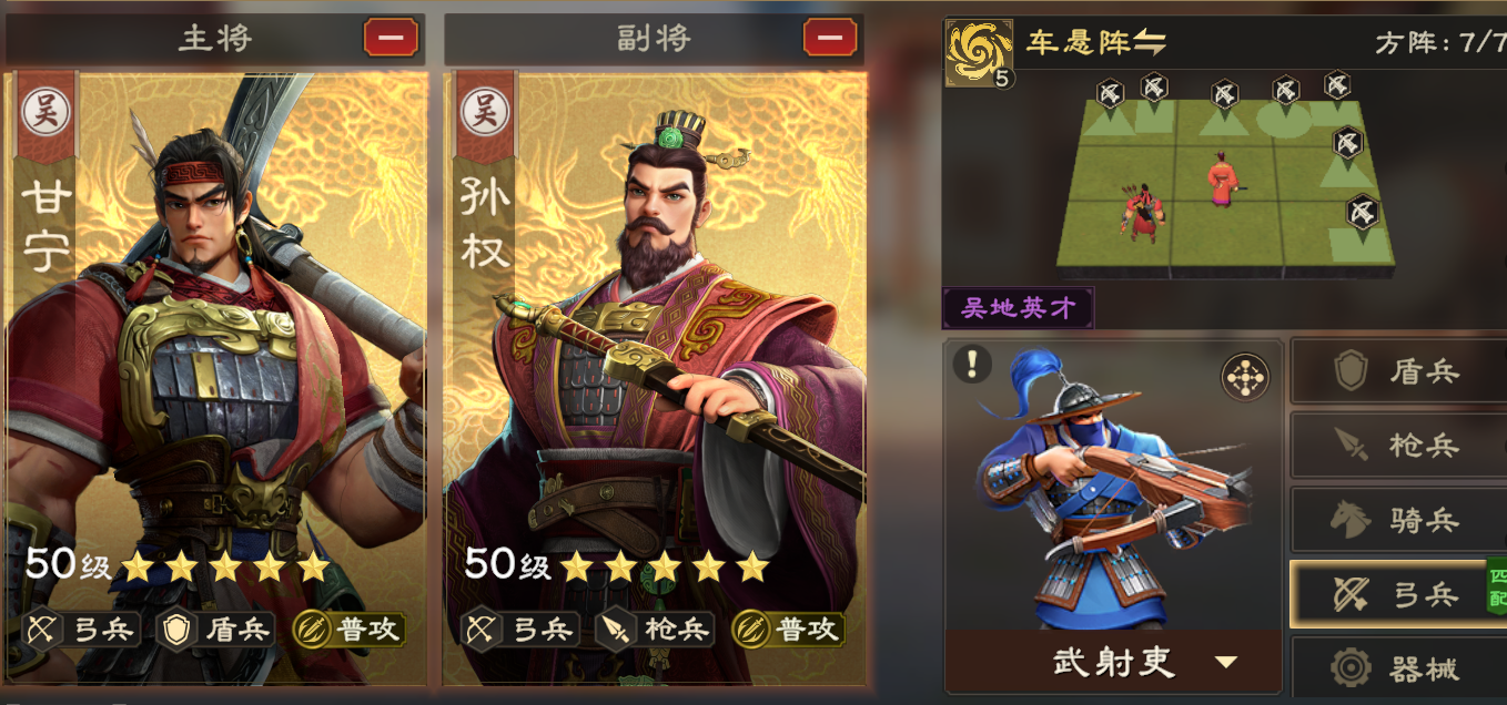 本期为大家介绍的队伍是东吴弓,是s1最强的普攻体系队伍,由甘宁和孙权组成。其简单配图如下: