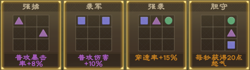 在触发效果上,最佳配置如下,分别为:强掳,袭军,强袭,胆守。