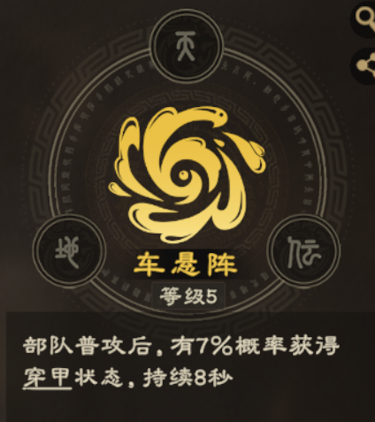 此处推荐车悬阵为该队伍唯一阵法,因为车悬阵能使部队获得穿甲效果(不会受到反击伤害),更加克制反击枪。