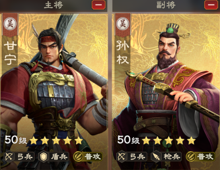 2. 甘宁和孙权的技能均可为队伍提供高额暴击率,除此之外甘宁还能提升普攻伤害,从而使部队依靠普攻就可打出大量伤害。