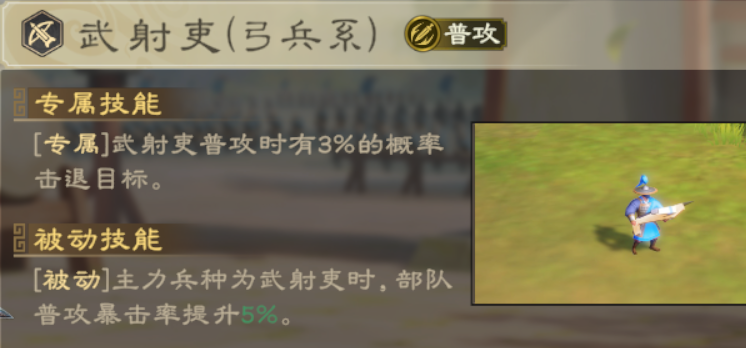 兵种上一定是推荐武射吏,因为武射吏可以普攻击退敌人,防止被敌军近战近身。除此之外武射吏还可以提升部队暴击几率,进一步增强输出能力。