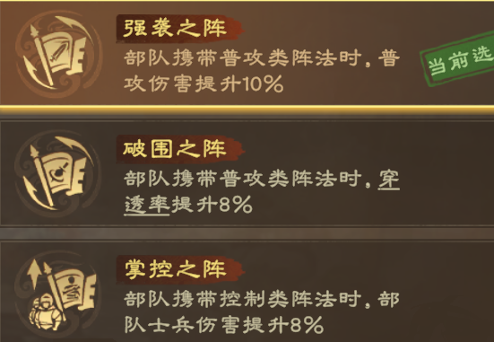 因为队伍的阵法选择为普攻类阵法,所以甘宁3星天赋选择“强袭之阵”,来提升普攻伤害。