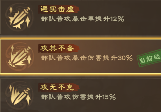 因部队暴击率可以堆满,所以甘宁的5星天赋这里选择“攻其不备”,来提升暴击伤害。