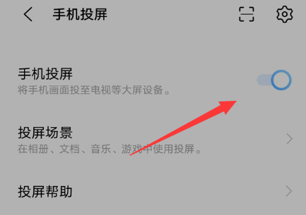 2、进入“手机投屏”设置中。将手机投屏的开关选项开启,然后按照指引搜索可用设备进行连接就可以了。