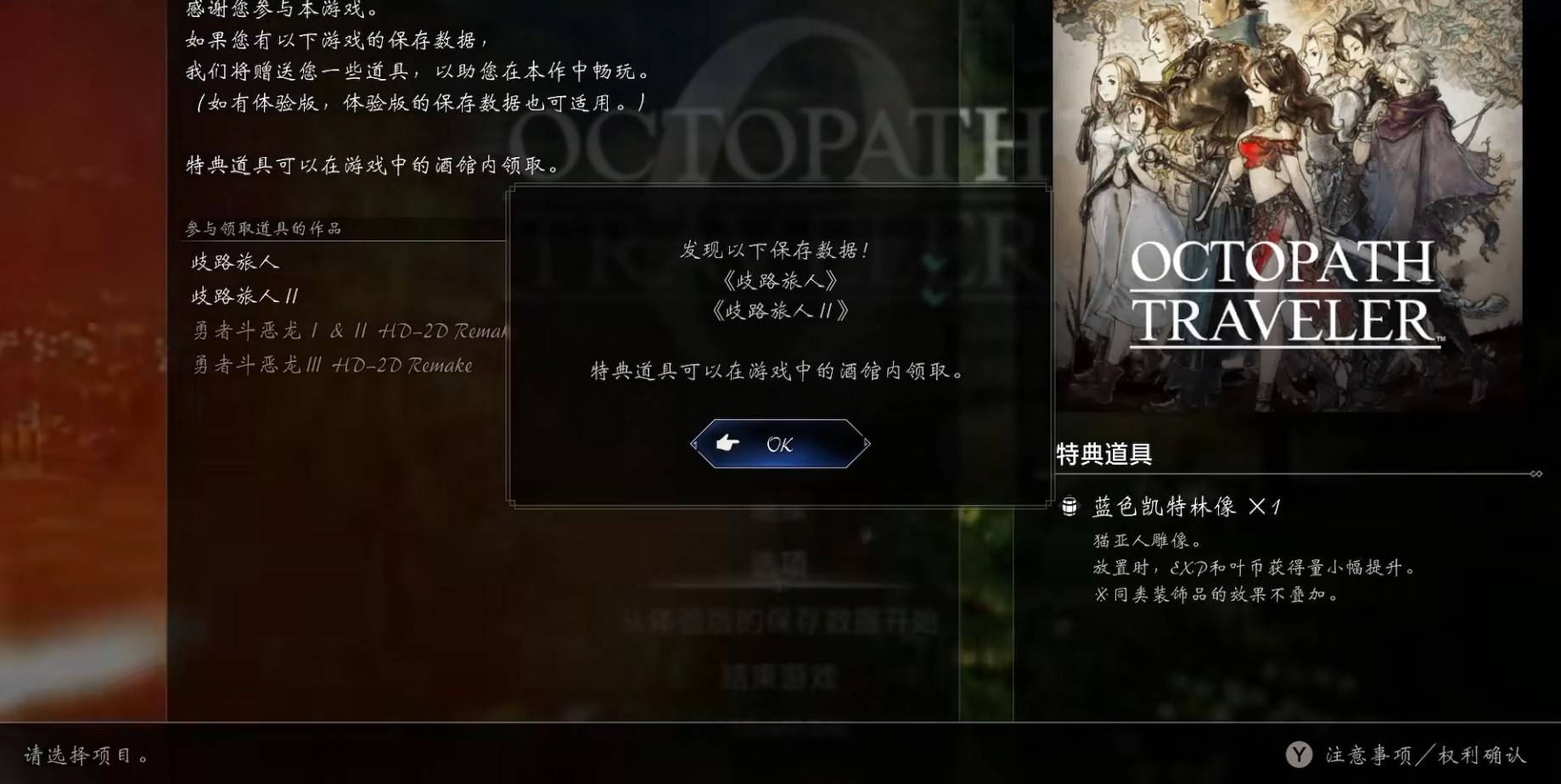本篇为大家带来的是歧路旅人0的联动特典领取方法,该联动特典是关于歧路旅人的前作,如果在相同设备中存在一代和二代等存档,即可在歧路旅人0中领取特定奖励,不过我们需要前往特定位置才能领取。