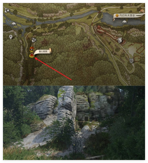 5、接着就需要朝着东南方向走然后穿过一座小桥就可以看到白色岩壁,然后就可以找到这个卷心菜洞,就可以看到这个卷心菜贼了。