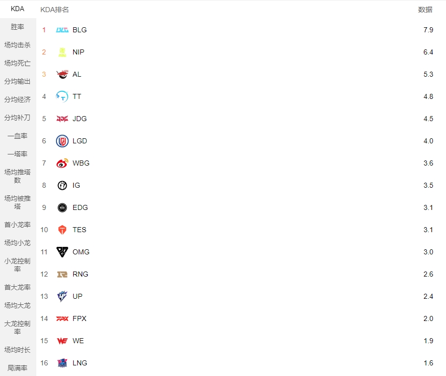 战队KDA排行榜