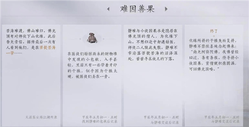 为大家分享燕云十六声武林录的探索任务中清河万事知任务菩提苦海之三难因善果的流程,佛光顶的师徒下山花园后杳无音讯,去寻找他们的下落。