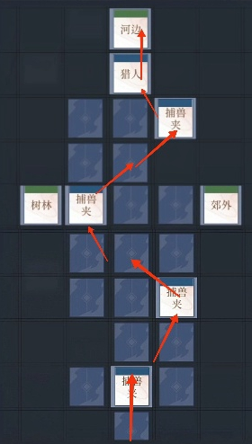 2、树林1:猎人-捕兽夹-前进右-捕兽夹-前进中-捕兽夹-前进中-捕兽夹-猎人-河边