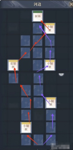 3、河边:小铜匣(紫)-小铜匣(紫)-小铜匣(紫)-树林-小铜匣(红)-花银匣(红)-树林