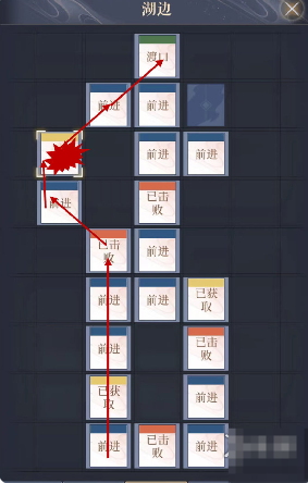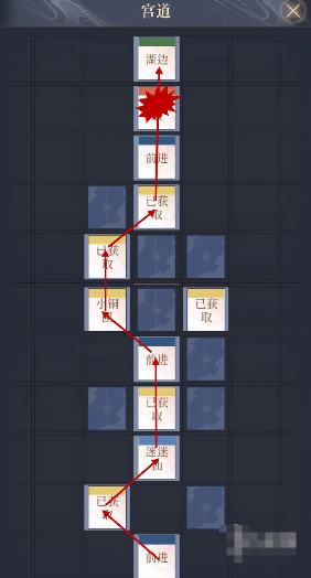 2、宫道:前进-木匣-迷迷仙-木匣-前进-小铜匣-木匣-木匣-前进-敌人-湖边