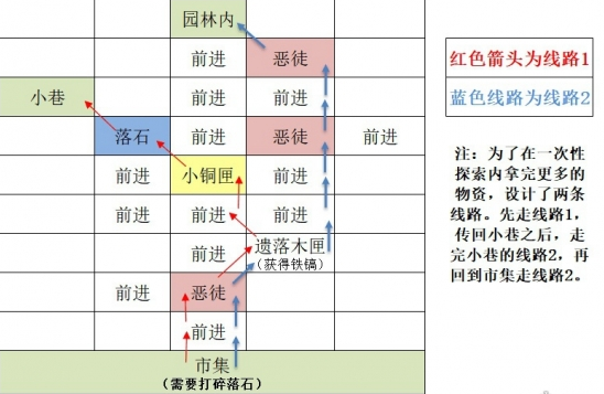 4、市集:前进-恶徒(红)-遗落木匣(获得铁镐)-前进-小铜匣-落石-小巷-恶徒(蓝)-遗落木匣(获得铁镐)-恶徒-恶徒-园林内
