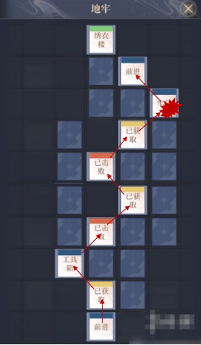3、地牢:前进-木匣-工具箱-敌人-木匣-敌人-木匣-牢门-前进