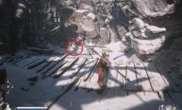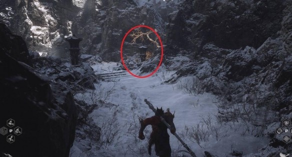 3.继续沿着路前进去前方被岩壁包围位置找到不白打架中间的位置就可以看到了。