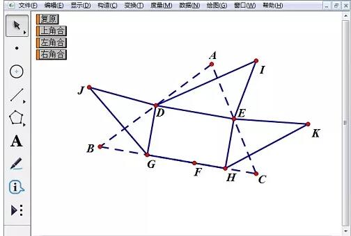 依次选中点I、A、J、B、K、C,选择“编辑”—“操作类按钮”—“移动”命令,将标签更改为“复原”。选中点I、F,选择“编辑”—“操作类按钮”—“移动”命令,将标签更改为“上角合”。选中点J、F,选择“编辑”—“操作类按钮”—“移动”命令,将标签更改为“左角合”。选中点K、F,选择“编辑”—“操作类按钮”—“移动”命令,将标签更改为“右角合”。