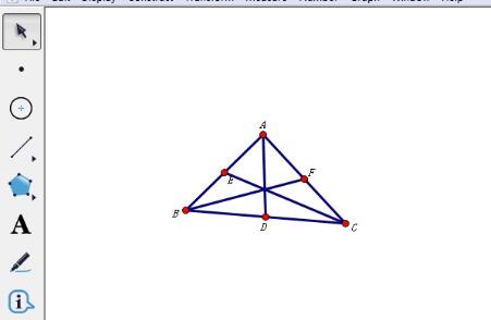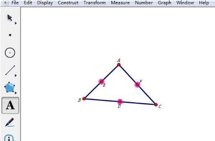 (2)单击菜单“构造”---“中点”(Ctrl+M),得到三边的中点,使用文本工具给各点标上标签,最终如图所示。