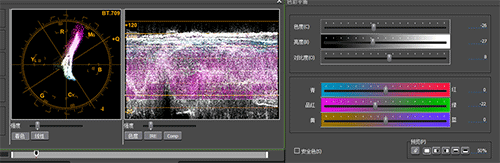 5、此时,可以对照着“矢量图示波器”来调整该页面中的色度、亮度和对比度,然后调整其色彩颜色到品红处,如图所示: