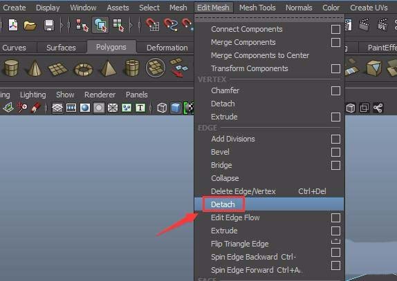 再在长方体上面点击鼠标右键在右键菜单里找到edge选项,然后双击中间的边选择这条循环边,然后在菜单那找到detach选项