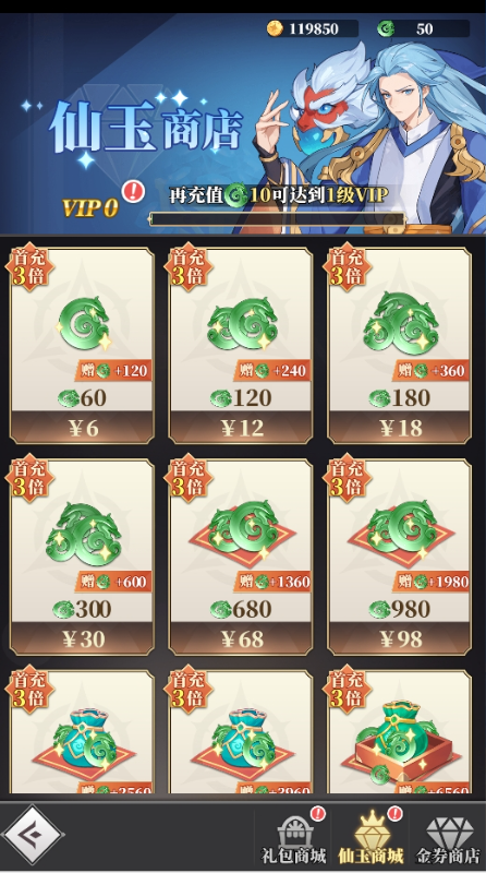 充值比例1元:10仙玉 ★【永久0.1折】全新0.1折版本,绝对真实折扣,充值648元仅需6.48元! ★【免费代金】每日免费648元代金券,完成日常任务再送648元代金券! ★【创角福利】开局SSR+核心输出“后羿”、绝版称号、万元充值卡,横扫主线就在此刻! ★【八日登录】次日送SSR+核心英雄自选,三日赠送传说装备套装,更有SP神话英雄自选豪礼不断! ★【免费满V】升级即可领取大量奖励和VIP经验,免费直达满V,一步登天! ★【每日签到】每日签到648元充值卡天天送! ★【万抽豪礼】天天有得抽,万抽送不停,更有SP神话英雄附加赠送! ★【战力达标】完成达标条件,获取顶级SP神话英雄“哪吒”,轻松制霸全服! ★后缀说明:开局SSR+核心输出“后羿”、绝版称号、万元充值卡,横扫主线就在此刻!