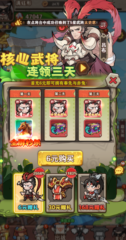 充值比例1元:100元宝 ★【全新三国】:原创石器时代的三国名将,Q版角色萌趣搞笑,战斗特效华丽而不浮夸! ★【放置养成】:采用自动战斗+离线收益的放置玩法,无需长时间在线,睡觉、上班也能轻松升级! ★【轻松战斗】:全自动战斗,轻策略,单手就能激情pk! ★【福利拉满】:登录即送蜀国名将SSR“张飞”,更有千抽福利,抽到爽。648?不存在的! ★后缀说明:千抽福利,游戏内通过活动可免费招募,选择自己喜欢的英雄
