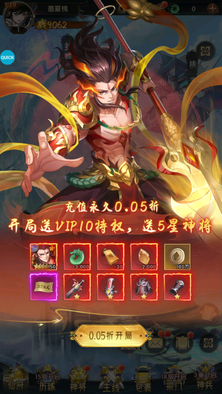 充值1元:10仙玉 ★【超低折扣】所有充值真实0.05折 ★【专属特权】上线即送VIP10,送神将哪吒,送全套红装 ★【海量抽卡】闯关送5000抽卡,升级再送幸运千抽自选 ★【满星神将】完成日常活跃新手任务,即送满星哪吒,助您征战天下 ★【每日扶持】海量充值卡,每日签到轻松领 ★【登录豪礼】登录2天送五星妲己,登录8天送神·嫦娥