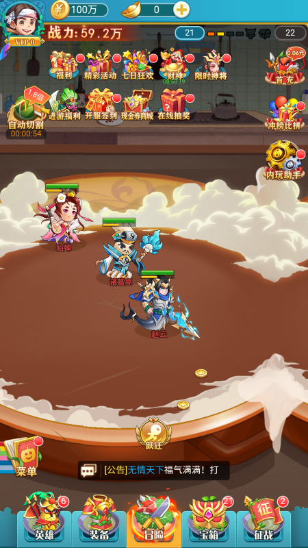 充值比例1元:10元宝 ★【食神0.05折神价】趣味卡牌开箱终身0.05折,首充6元仅0.03元秒进,一杯豆浆钱开局!! ★【每日6480现金劵】进游先领1000现金劵,直升VIP特权,每日最高领6480现金劵! ★【满星SS神将关羽】新服狂欢送满星 SS 红将关羽,1000W 战力碾压 BOSS,开局即巅峰! ★【终身百万充值】累计登录领 100 万充值卡!SSR 英雄、顶级厨具全靠送,零氪毕业! ★【养老内玩助手】全新内玩破解助手,破境飞升特权养老,新服资源秒抢,佛系党也能制霸! ★【新服登录豪礼】新服登录送顶级SSS英雄,超级巅峰阵容一键成型,新手村直接起飞! ★【全新英雄 UP】时空 SSS 英雄来袭,花式搭配不重样,策略脑洞无限开! ★后缀说明:新服登录豪礼,送满星SS神将关羽