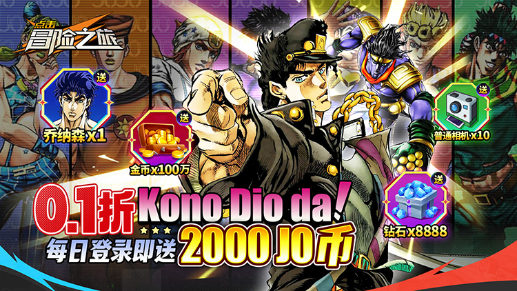 充值比例1元:10游戏货币 ★免费版:游戏内每天送2000JO币(无门槛,可拆分)! ★创角即送乔纳森·乔斯达碎片*60、钻石*8888、金币*1000000、普通相机*10、红茶*10 ★充值永久0.1折,648元只需6.48元! ★深度还原原作角色搭配原汁原味的技能,完美复刻! ★跨服互动玩法,百人同屏,千人夺宝! ★后缀说明: 充值全部0.1折,每天免费领取JO币*2000