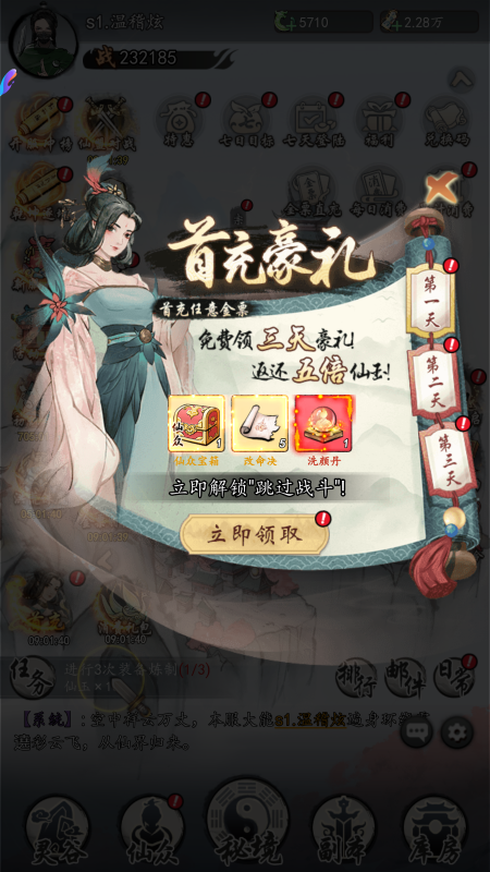充值比例1元:10仙玉 ★1折免费版:每日登录免费秒领 648 元代金券,礼包买买买累充奖励全领,首充双倍元宝拿到手软! ★通关 288 连抽:从筑基到渡劫全程保送,保必出极品仙友,战力飙升如坐火箭! ★开宗立派特权:凡人逆天改命,宗门建设特权加速修仙,广纳天灵根弟子,渡劫飞升真仙一统三界! ★后缀说明:每日登录送648代金券,通关送288连抽!